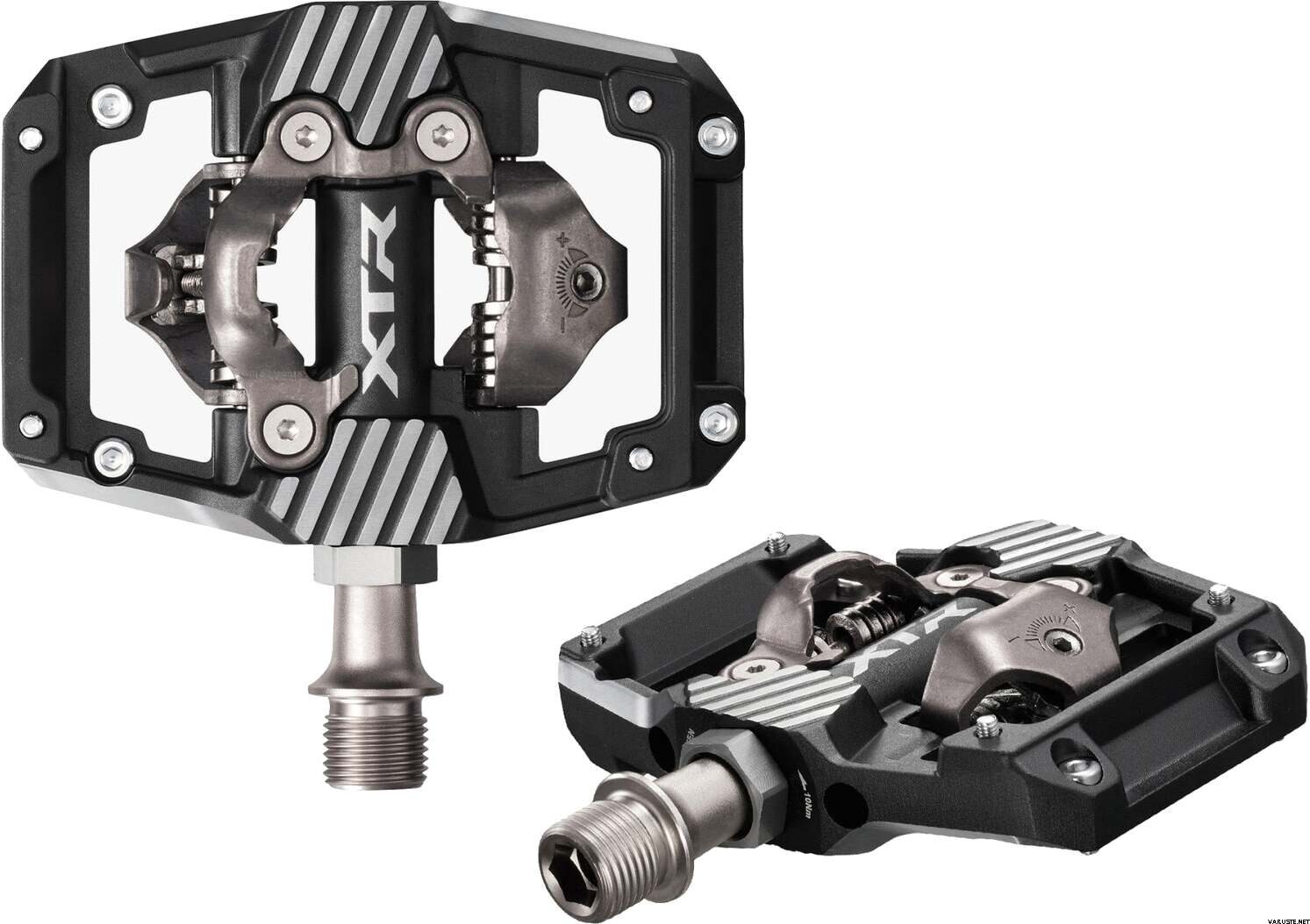 Shimano PD-M9220 XTR Pedal SPD w/ Cleat CL-MT001 on kestävä enduropoljin, joka on suunniteltu vaativaan maastopyöräilyyn ja kilpa-ajoon. XTR-tason poljin tarjoaa laajemman kosketuspinnan parantaen polkemistehokkuutta nousuissa. Korotettu alusta ja säädettävät pitopehmusteet lisäävät hallintaa ja vakautta laskuissa. Polkimen kestävä ulkokehys suojaa iskuja vastaan, mikä takaa pitkän käyttöiän vaativilla poluilla. Mukana tulevat CL-MT001 SPD -klossit monisuuntaisen kiinnityksen.